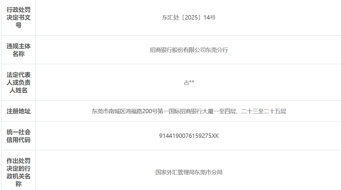 11月27日,国家外汇管理局广东省分局行政处罚信息公示显示,招商银行股份有限公司东莞分行因办理经常项目资金收付,未对交易单证的真实性及其与外汇收支的一致性进行合理审查,违反规定办理结汇业务被罚款、没收违法所得54.26万元。