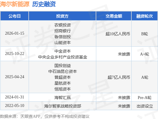 证券之星消息,根据天眼查APP于1月15日公布的信息整理,海尔新能源科技股份有限公司B轮融资,融资额超10亿人民币,参与投资的机构包括农银投资,招商银行,鲁信创投,山能资本。