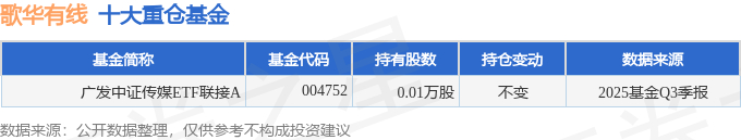 持有歌华有线最多的基金为广发中证传媒ETF联接A,目前规模为6.25亿元,最新净值0.9791(10月30日),较上一交易日下跌1.47%,近一年上涨27.7%。该基金现任基金经理为罗国庆。