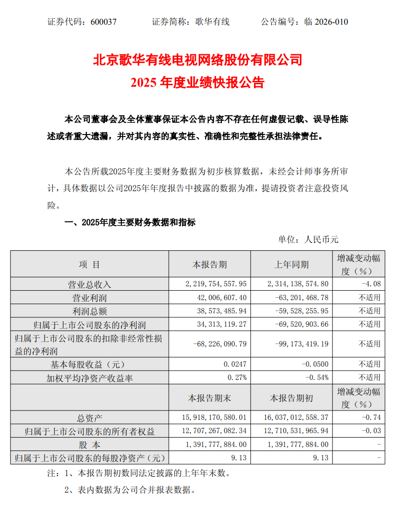 投资收益等增幅较大 歌华有线2025年净利润同比扭亏为盈