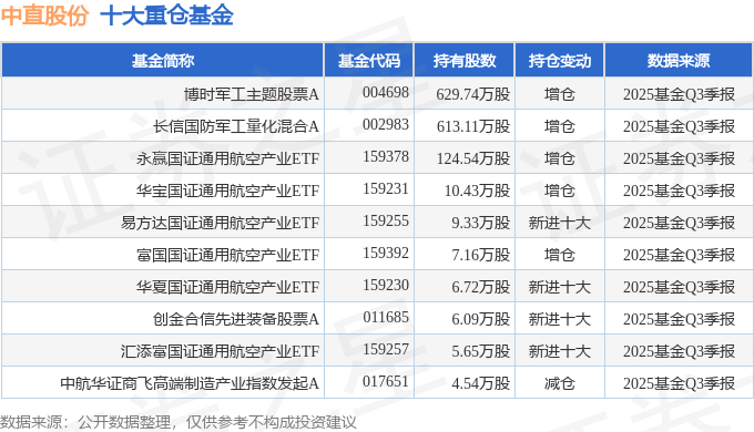 持有中直股份最多的基金为博时军工主题股票A,目前规模为24.48亿元,最新净值1.986(10月29日),较上一交易日上涨0.15%,近一年上涨44.23%。该基金现任基金经理为曾鹏。