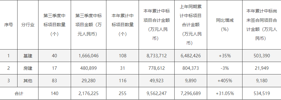 10月10日公告,前9月累计中标项目合计金额956.22亿元,同比上涨31.05%。