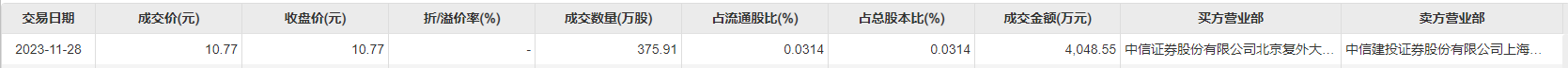 今日大宗交易成交375.91万股,成交额4048.55万元,占当日总成交额的6.36%,成交价10.77元,较市场收盘价持平。