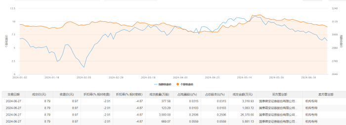 6月27日大宗交易成交4169.94万股,成交额3.67亿元,占当日总成交额的29.41%,成交价8.79元,较市场收盘价8.97元折价2.01%。
