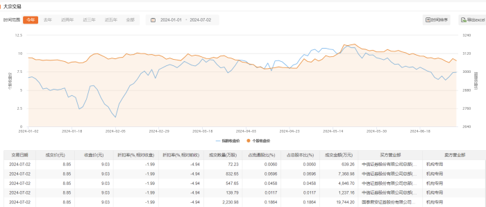 今日大宗交易成交3823.3万股,成交额3.38亿元,占当日总成交额的22.79%,成交价8.85元,较市场收盘价折价1.99%。