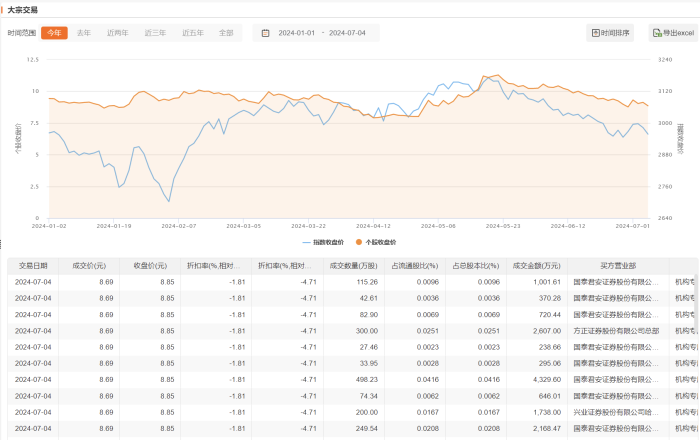 今日大宗交易成交1624.29万股,成交额1.41亿元,占当日总成交额的14.42%,成交价8.69元,较市场收盘价折价1.81%。
