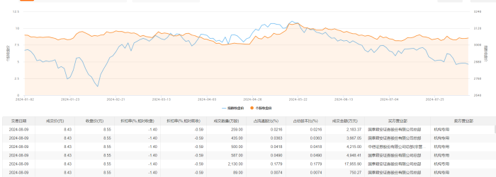 8月9日大宗交易成交4000万股,成交额3.37亿元,占当日总成交额的17.76%,成交价8.43元,较市场收盘价8.55元折价1.4%。