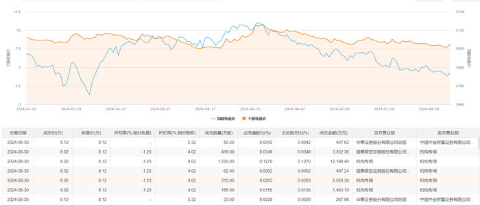 保利发展8月30日大宗交易成交2583.2万股,成交额2.07亿元,占当日总成交额的7.89%,成交均价8.02元,较市场收盘价8.12元折价1.23%,其中最高成交价8.12元,最低成交价8.02元。