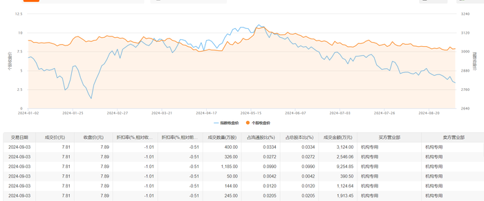 9月3日大宗交易成交2350万股,成交额1.84亿元,占当日总成交额的15.97%,成交价7.81元,较市场收盘价7.89元折价1.01%。