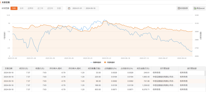 今日大宗交易成交1320万股,成交额9992.4万元,占当日总成交额的9.75%,成交价7.57元,较市场收盘价折价0.79%。