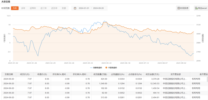 今日大宗交易成交2530万股,成交额2.02亿元,占当日总成交额的12.1%,成交价7.97元,较市场收盘价折价0.99%。