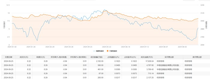 9月25日大宗交易成交3570万股,成交额2.93亿元,占当日总成交额的11.2%,成交价8.22元,较市场收盘价8.29元折价0.84%。