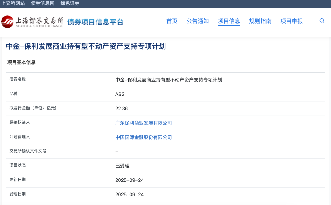 据上交所官网显示,中金-保利发展商业持有型不动产资产支持专项计划正式申报并获得受理。该项目原始权益人为广东保利商业发展有限公司,计划管理人为中国国际金融股份有限公司,拟发行金额22.36亿元。