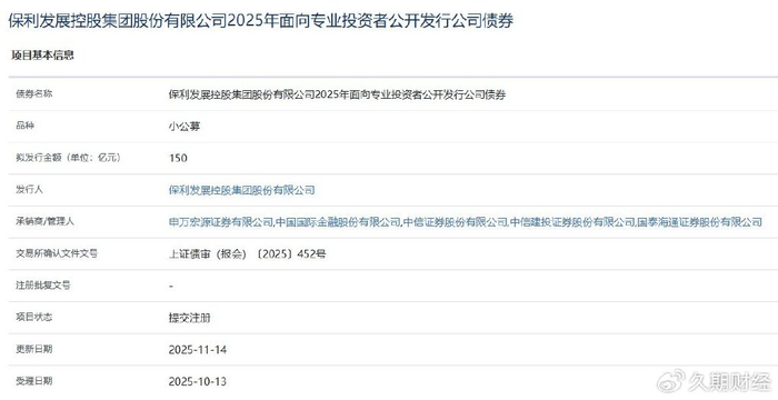 讯,11月14日,上交所公司债券项目信息平台显示,保利发展控股集团股份有限公司(简称“保利发展”,600048.SH)人民币150亿元小公募项目项目状态更新至“提交注册”。