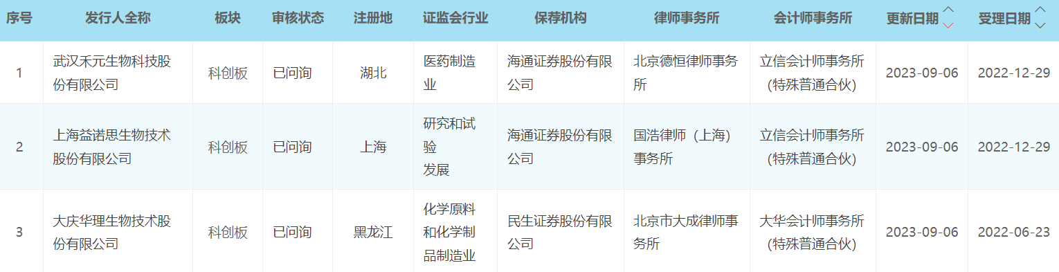 3家科创板拟上市公司发审状态更新 禾元生物、华理生物、益诺思已问询