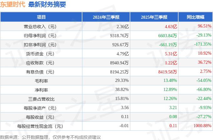 据证券之星公开数据整理,近期东望时代(600052)发布2025年三季报。根据财报显示,东望时代增收不增利。截至本报告期末,公司营业总收入4.63亿元,同比上升96.51%,归母净利润6603.84万元,同比下降29.13%。按单季度数据看,第三季度营业总收入9963.4万元,同比上升75.79%,第三季度归母净利润-46.92万元,同比上升90.74%。