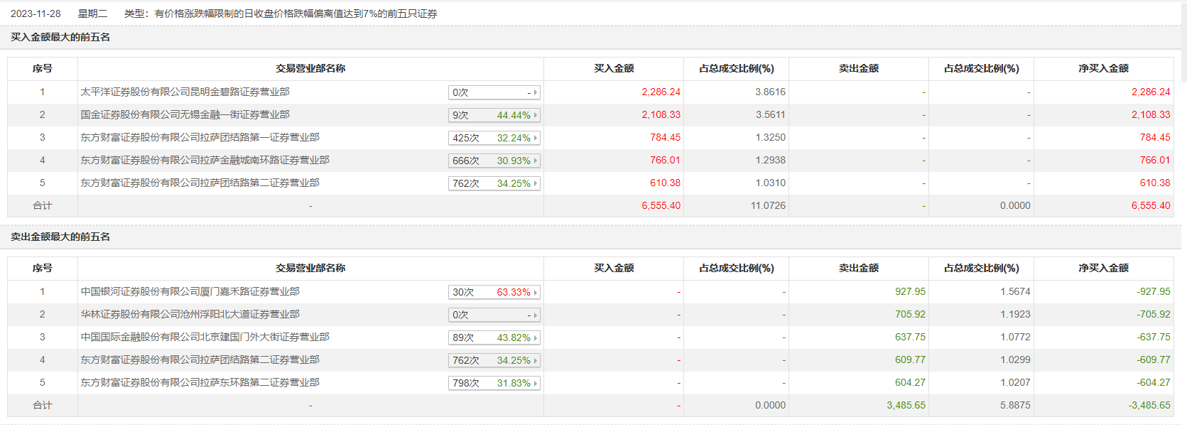 11月28日,九鼎投资今日跌停,全天换手率达8.25%,振幅达9.02%。龙虎榜数据显示,营业部席位合计净买入3069.75万元。其中,中国银河证券厦门嘉禾路证券营业部、华林证券沧州浮阳北大道证券营业部分别卖出927.95万元、705.92万元;太平洋证券昆明金碧路证券营业部、国金证券无锡金融一街证券营业部分别买入2286.24万元、2108.33万元。