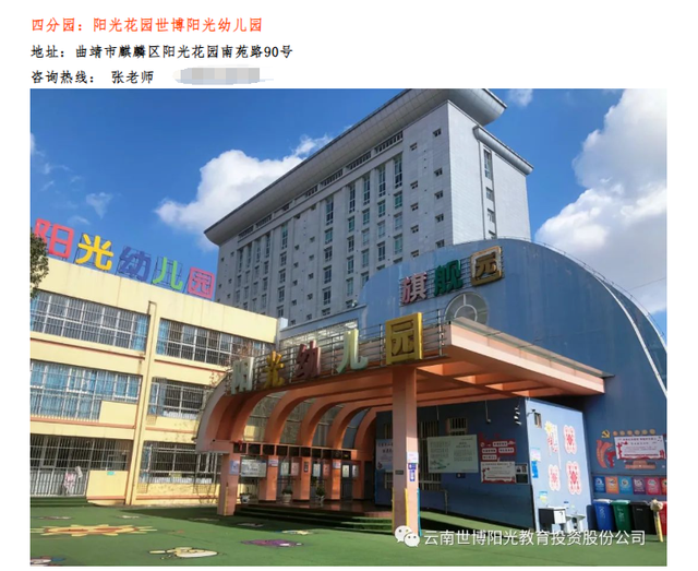 红星资本局梳理发现,阳光花园幼儿园是云南世博阳光教育投资股份有限公司(简称“云南世博教育”)旗下的众多幼儿园之一。云南世博教育今年1月在官方微信号发布的文章显示,公司旗下四分园与前述阳光花园幼儿园是同一地址,公司的总经理也是王爱平。