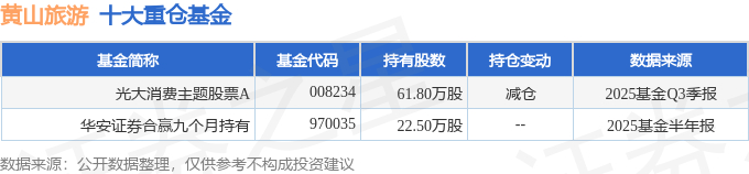 持有黄山旅游最多的基金为光大消费主题股票A,目前规模为1.42亿元,最新净值1.0892(10月29日),较上一交易日上涨0.91%,近一年上涨4.26%。该基金现任基金经理为马鹏飞。