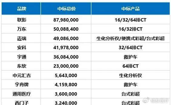 - 5月河南省县域医共体设备更新集采,16排CT中标单价仅59.68万元,比主要竞标对手报价低24%,32排CT中标价92.29万元,几乎是预算价格的一半。
