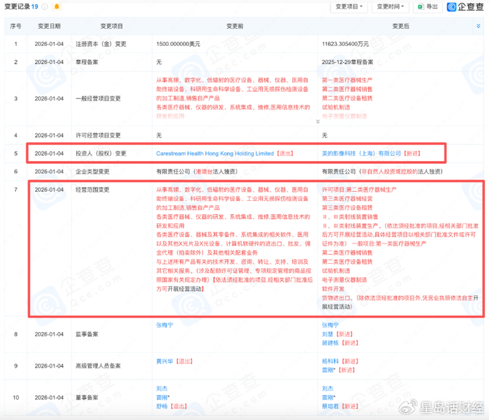 1月4日,专注X射线检查系统及医学影像处理等领域的锐珂上海,其股东已变更为美的集团100%控股的美的影像科技(上海)有限公司(以下简称:“美的影像”),同时企业的经营范围、企业类型、注册资本、董事及高管人员等也进行了一系列的变更。