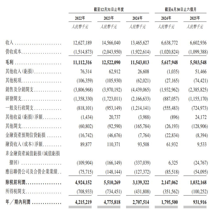 业绩方面,于2022年度、2023年度、2024年度及2025年截至6月30日止六个月,该公司实现收入分别约为126.27亿元、145.66亿元、134.66亿元、66.03亿元人民币;同期,年/期内利润约为42.15亿元、47.76亿元、27.08亿元、9.32亿元人民币。