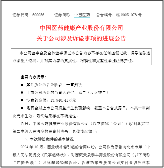 这场法律纠纷始于2024年10月,因业绩补偿问题,中国医药当时作为原告向北京市第二中级人民法院提起诉讼,将西藏天晟及徐攀峰告上法庭。