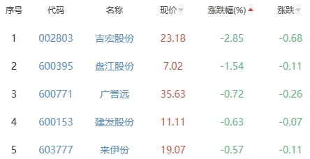 吉宏股份、盘江股份、广誉远、建发股份、来伊份位列涨幅榜后五位,涨幅分别为-2.85%、-1.54%、-0.72%、-0.63%、-0.57%。