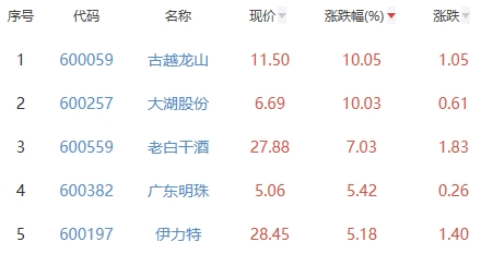 其中,古越龙山、大湖股份、老白干酒、广东明珠、伊力特位列板块涨幅前五位,涨幅分别为10.05%、10.03%、7.03%、5.42%、5.18%。