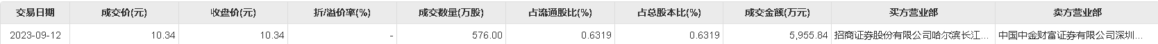 9月12日大宗交易成交576万股,成交额5955.84万元,占当日总成交额的33.02%,成交价10.34元,较市场收盘价10.34元持平。