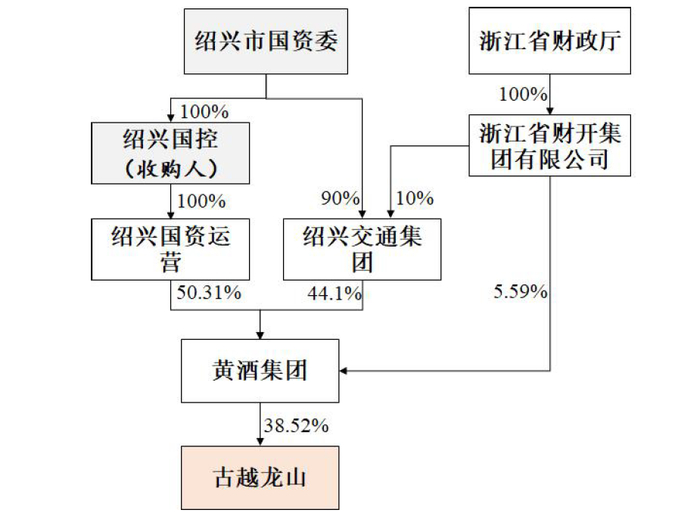 根据报告书,本次收购核心路径为:绍兴市国资委以其持有的绍兴市国有资本运营有限公司(下称“绍兴国资运营”)100%股权作价出资入股绍兴国控。交易完成后,绍兴国控成为绍兴国资运营全资股东,进而通过绍兴国资运营控股的中国绍兴黄酒集团有限公司(古越龙山直接控股股东,下称“黄酒集团”),间接实现对古越龙山的控股。