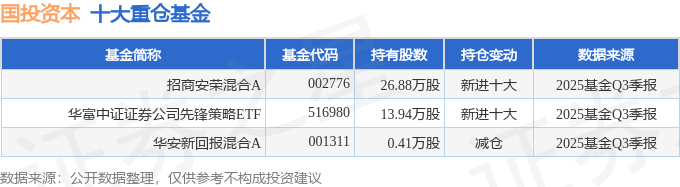 持有国投资本最多的基金为招商安荣混合A,目前规模为0.46亿元,最新净值1.9914(10月30日),较上一交易日下跌2.64%,近一年上涨25.83%。该基金现任基金经理为程泉璋。