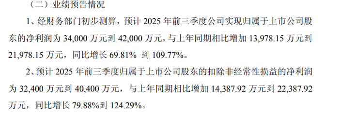 公告显示,经财务部门初步测算,皖维高新预计2025年前三季度实现归属于上市公司股东的净利润为3.40亿元到4.20亿元,与上年同期的2.00亿元相比,增加1.40亿元到2.20亿元,同比增长69.81% 到109.77%;预计归属于上市公司股东的扣除非经常性损益的净利润为3.24亿元到4.04亿元,与上年同期的1.80亿元相比,增加1.44亿元到2.24亿元,同比增长79.88%到124.29%。上年同期基本每股收益为0.09元。本次业绩预告的数据未经审计机构审计。