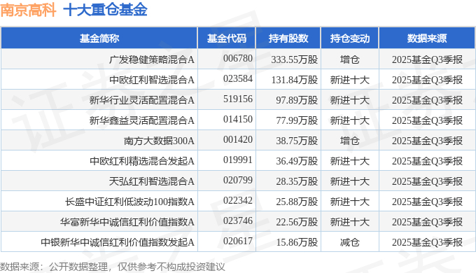 持有南京高科最多的基金为广发稳健策略混合A,目前规模为12.53亿元,最新净值1.6891(10月31日),较上一交易日下跌0.96%,近一年上涨27.96%。该基金现任基金经理为杨冬。