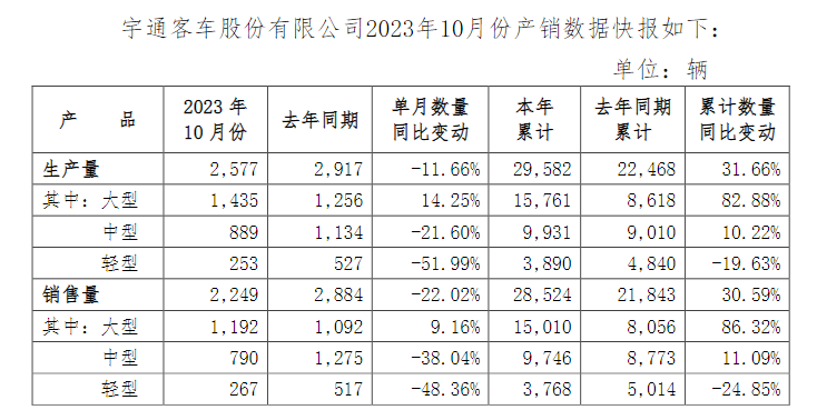 11月3日公告,公司前三季度销售量2.18万辆,同比增长30.59%;生产量2.96万辆,同比增长31.66%。