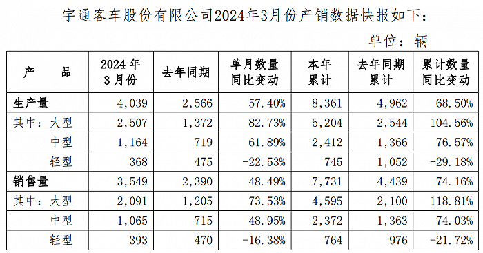 4月3日公告,2024年3月销售3549辆,同比增长48.49%;1-3月销量7731辆,同比增长74.16%。