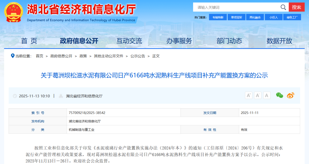 11月13日,湖北省经信厅发布“关于葛洲坝松滋水泥有限公司日产6166吨水泥熟料生产线项目补充产能置换方案的公示”。