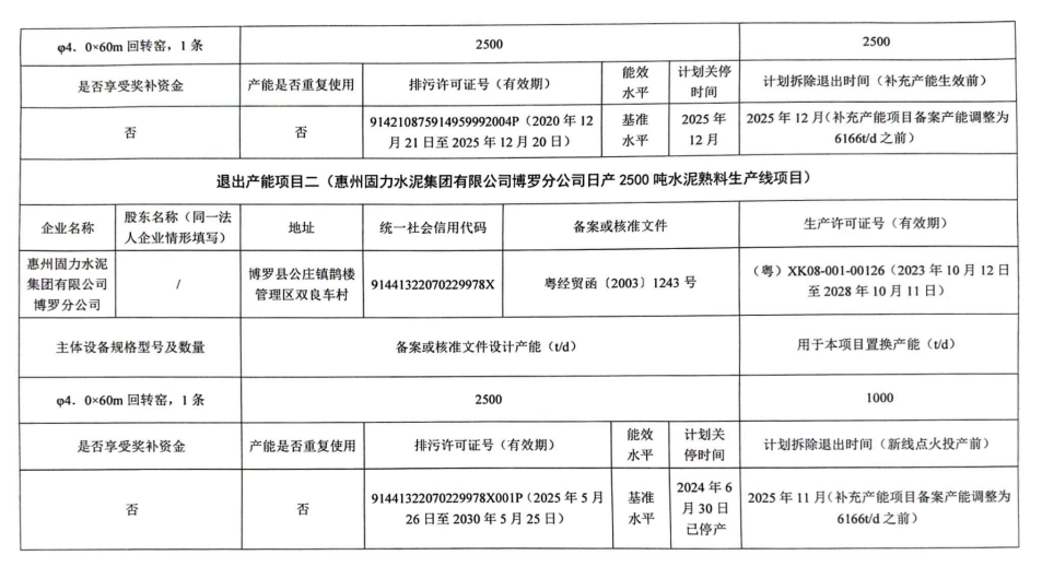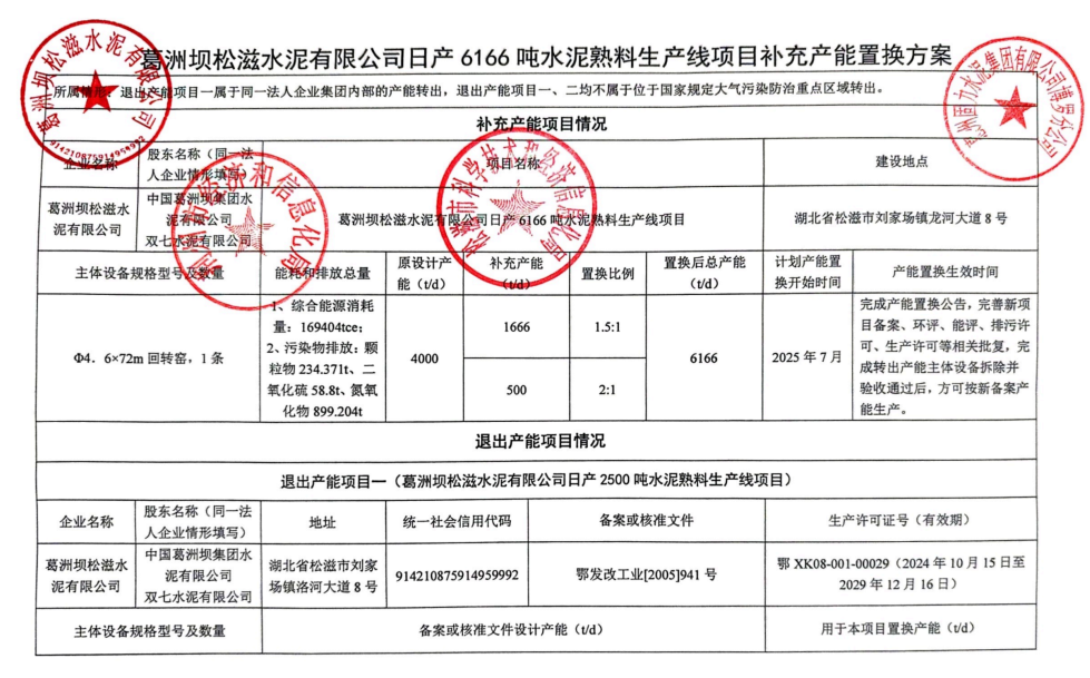 置换方案显示,葛洲坝松滋水泥一条4000t/d熟料生产线补充产能2166t/d,补充后产能6166t/d,退出产能来自同公司一条2500t/d熟料生产线及惠州固力水泥博罗分公司一条2500t/d熟料线(用于本项目1000t/d),前者置换比例1.5:1,后者2:1。