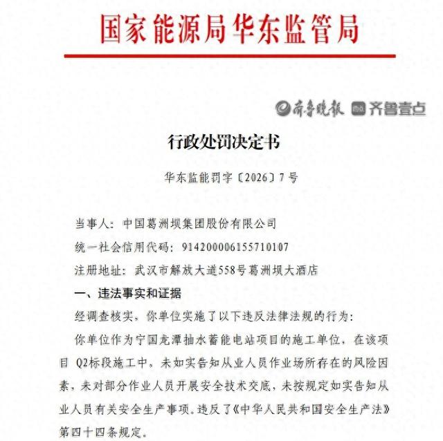 近日,国家能源局华东监管局发布行政处罚决定书华东监能罚字(2026)7号。