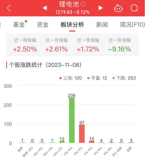 中国经济网北京11月8日讯今日,锂电池板块整体跌幅0.12%,其中120只股票上涨,12只股票平盘,253只股票下跌。
