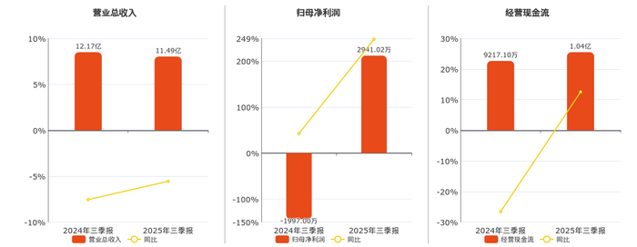 公司营业总收入为11.49亿元。归母净利润为2941.02万元,较去年同报告期归母净利润增加4938.03万元,实现2年连续上涨。经营活动现金净流入为1.04亿元,较去年同报告期经营活动现金净流入增加1152.77万元,同比较去年同期上涨12.51%。