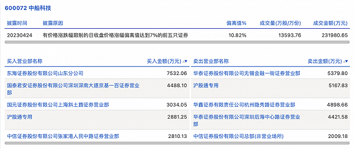具体来看,东海证券山东分公司、国泰君安证券深圳深南大道京基一百证券营业部分别买入7532.06万元、4488.10万元;华泰证券无锡金融一街证券营业部、沪股通专用分别卖出5379.80万元、5167.83万元。