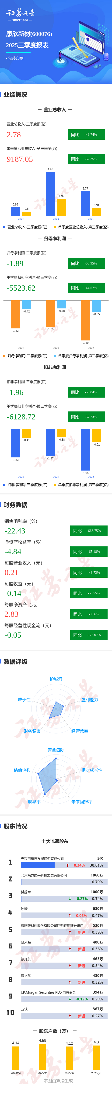证券之星消息,康欣新材2025年三季报显示,公司主营收入2.78亿元,同比下降43.74%;归母净利润-1.89亿元,同比下降50.96%;扣非净利润-1.96亿元,同比下降53.04%;其中2025年第三季度,公司单季度主营收入9187.05万元,同比下降52.36%;单季度归母净利润-5523.62万元,同比下降44.57%;单季度扣非净利润-6128.72万元,同比下降57.24%;负债率42.52%,投资收益614.44万元,财务费用5924.6万元,毛利率-22.43%。