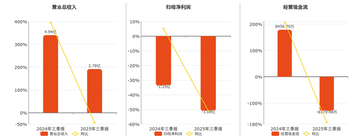 公司营业总收入为2.78亿元,较去年同报告期营业总收入减少2.16亿元,同比较去年同期下降43.74%。归母净利润为-1.89亿元,较去年同报告期归母净利润减少6394.39万元。经营活动现金净流入为-6179.48万元,较去年同报告期经营活动现金净流入减少1.46亿元,同比较去年同期下降173.07%。