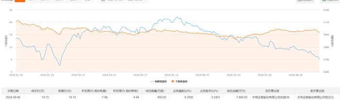 9月6日大宗交易成交400万股,成交额7488万元,占当日总成交额的19.13%,成交价18.72元,较市场收盘价19.1元折价1.99%。