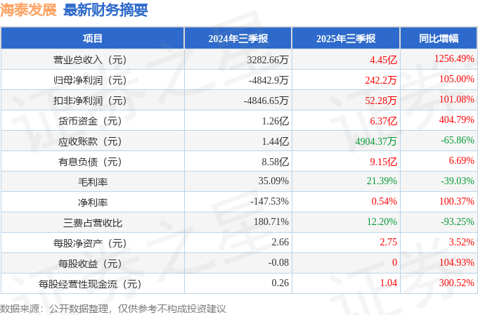 据证券之星公开数据整理,近期海泰发展(600082)发布2025年三季报。根据财报显示,海泰发展营收净利润同比双双增长。截至本报告期末,公司营业总收入4.45亿元,同比上升1256.49%,归母净利润242.2万元,同比上升105.0%。按单季度数据看,第三季度营业总收入4.27亿元,同比上升7022.81%,第三季度归母净利润3248.47万元,同比上升282.72%。