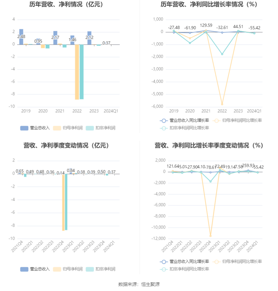 截至2024年一季度末,公司经营活动现金流净额为-4374.34万元,同比减少6611.77万元;投资活动现金流净额-94.96万元,上年同期为-199.19万元。