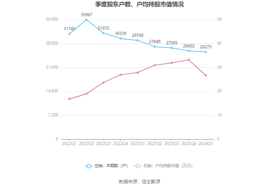 筹码集中度方面,截至2024年一季度末,公司股东总户数为2.63万户,较上年末下降了327户,降幅1.23%;户均持股市值由上年末的33.20万元下降至26.69万元,降幅为19.61%。