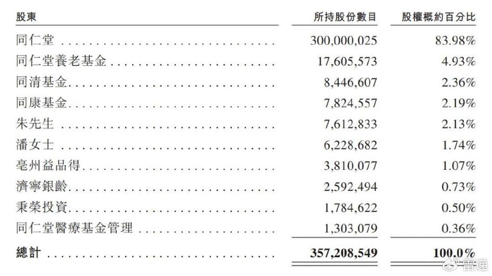 其中,同仁堂持股为83.98%,同仁堂养老基金持股为4.93%,同康基金持股为2.19%,同仁堂医疗基金管理持股为0.36%,同清基金持股为2.36%,朱先生持股为2.13%,潘女士持股为1.74%,亳州益品得持股为1.07%,济宁银龄持股为0.73%,秉荣投资持股为0.5%。