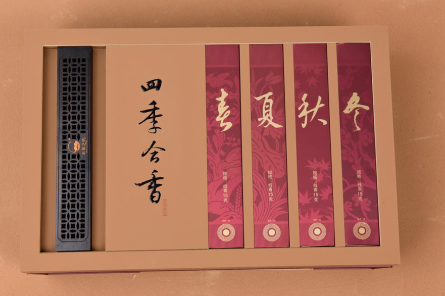 北京同仁堂有三百五十余年的历史,其中供奉清代皇宫御药188年。在这期间接触到了大量皇宫的御药方和经验方,企业依托传统中医药文化内涵,参考了宋代《陈氏香谱》、明代《晦斋香谱》、清代《太医院秘藏膏丹丸散方剂》等古代文献,以传统古方为基础,运用中医理论,依据春、夏、秋、冬四季自然规律以及对人体的影响,以君、臣、佐、辅的合香理论,兼顾对外交流、文化体验活动等场景需要,研发出了四季合香。